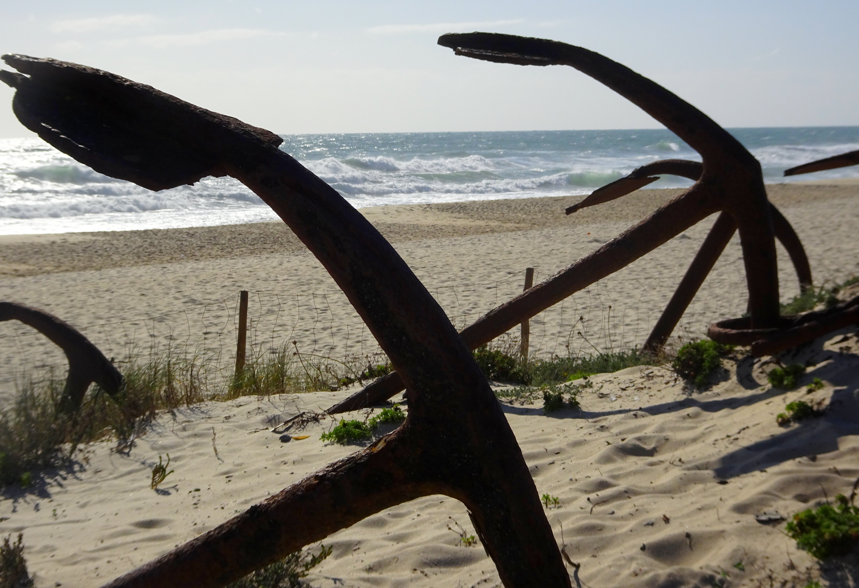 Ved badestranden ser man dette syn. En ankerkirkegård.
