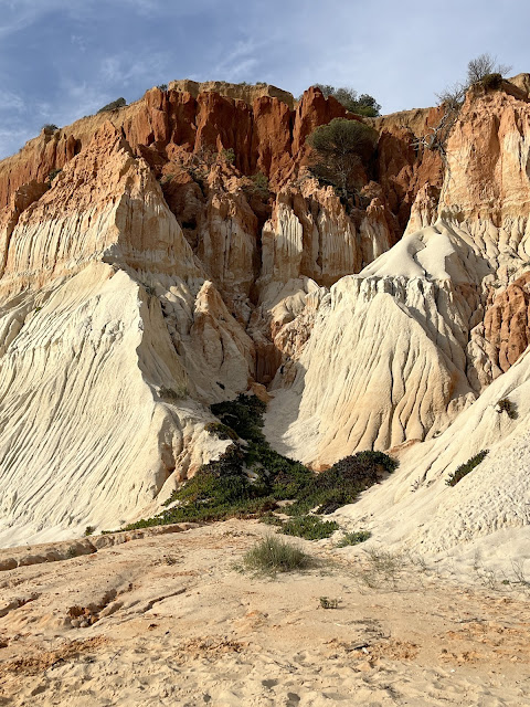Vi kørte til Olhos de Aqua mellem Albufeira og Quarteira, hvor der var en rigtig fin vandretur ovenfor klinterne, og så kunne vi gå langs stranden Praia de Falésia på vejen tilbage.