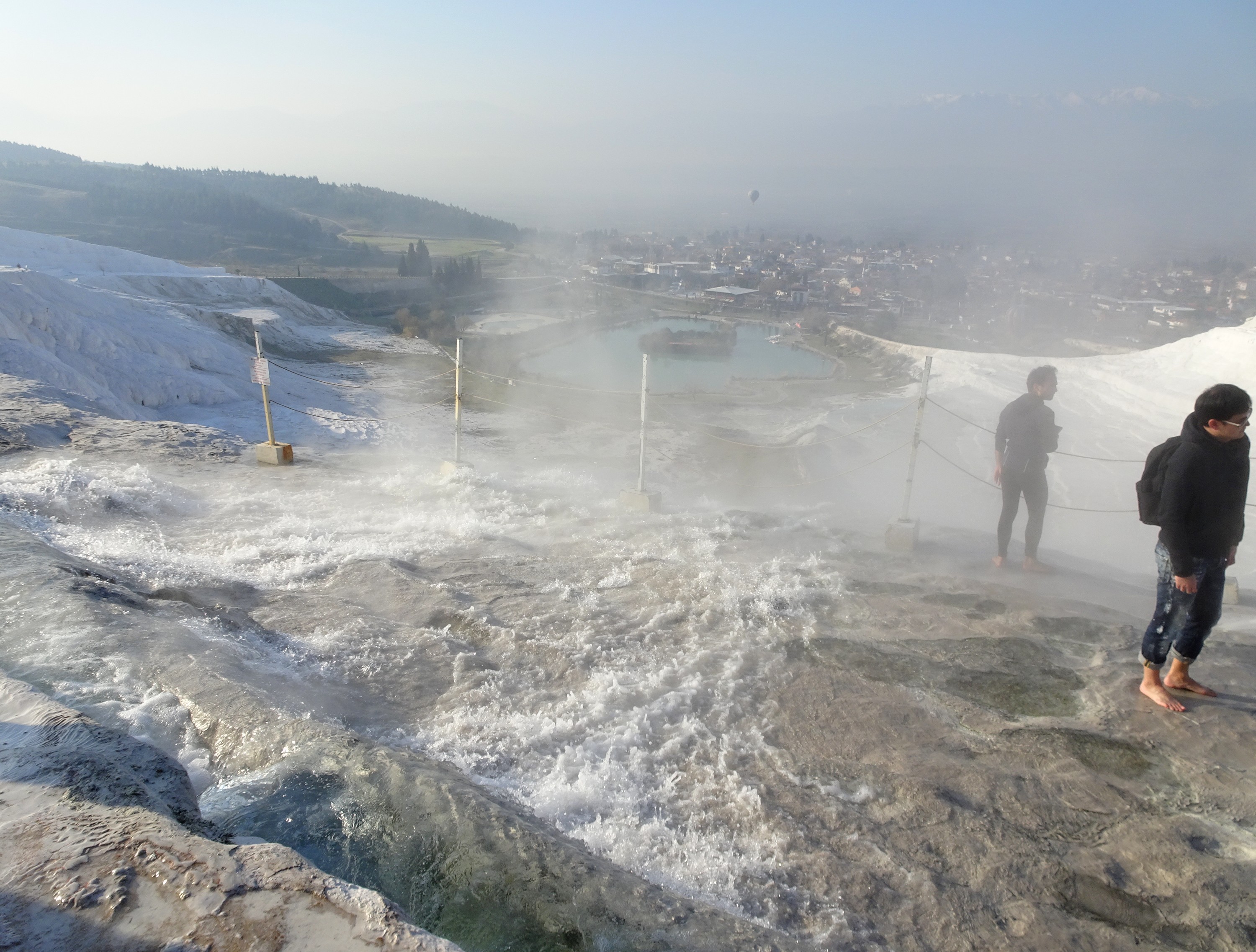 | En turist i forbudt område ved kalkterrasserne! I baggrunden byen Pamukkala |